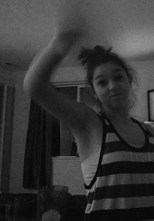 | Black and white photo of me with sparkly tree branch. Shows my girly girl side. |